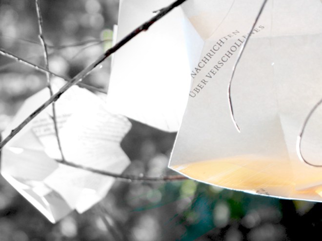 Gestern enthüllte das niedergeschriebene Wort noch die Dunkelheit. Heute verhüllt sie die Helligkeit. Ein neuer Tag: Regen- und Tautropfen glänzen in der Sonne und ich entdecke „Nachrichten über Verschollenes“.