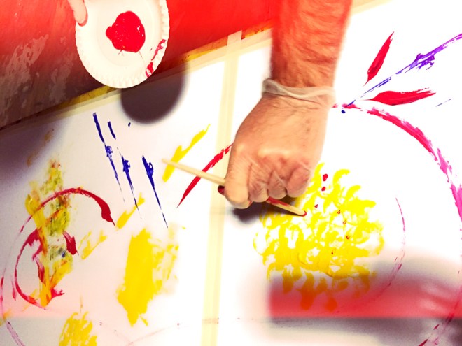 Mit Hölzern, Isolationsrohren und Pappwaben setzen wir Farbakzente auf eine fünf Meter lange Papier-Banderole. In mehreren Takes variierten wir unsere Handlungsweisen. Wiederholende versus neuartige Farbsetzungen, großzügige versus begrenzende Malbewegungen, pointiertes versus vernetzendes Zeichnen. Das Nichts ermöglichte Fülle. Ein Nicht-Nichts.