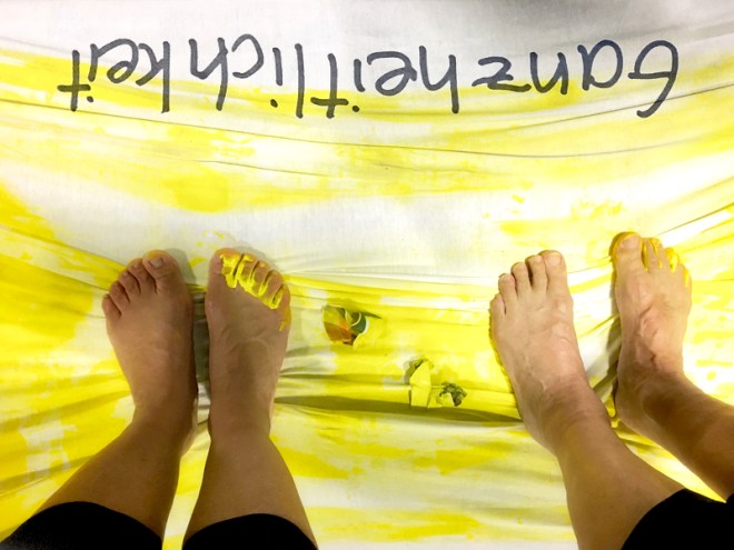 Das Beschreiten der Melange aus gespannter Stofflichkeit und fluiden Gebilden mündete im non-verbalen Stehen. Eine Verwurzelung, die ihre Festigkeit erst durch den Anderen zu erwerben vermochte. Zur Ganzheitlichkeit.