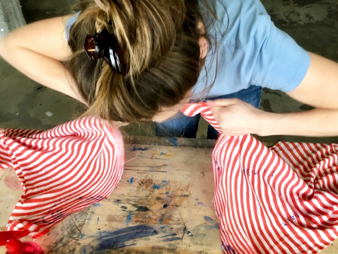 Welches Ich möchte ich wie leben? Was ist verdeckt? Diesen Fragen gingen wir heute künstlerisch und wie sich zeigte „voller Vehemenz“ im Atelier nach. Über „wehende Fahnen“ in Form unterschiedlicher Tuchbahnen wurde eine Reise in eine fremde Welt eingeläutet. Mit dem Reiz des ungewissenen Ausgangs. Aber mit der Gewissheit, dass mehr unter dem Gewohnten schlummert.