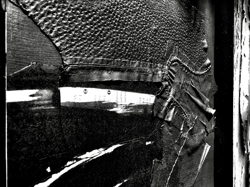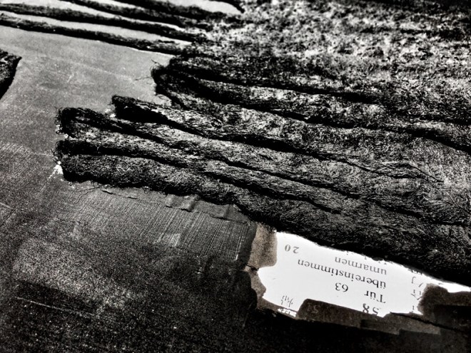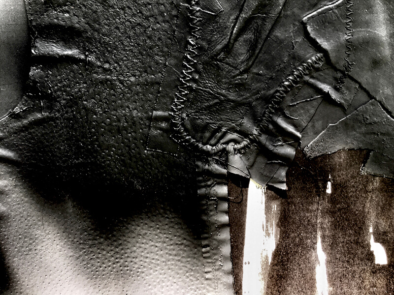 Friday-Artwork beim Trocknen in der Sonne. Leder, Stoff und Filz – getränkt in tiefschwarzer Acrylfarbe.