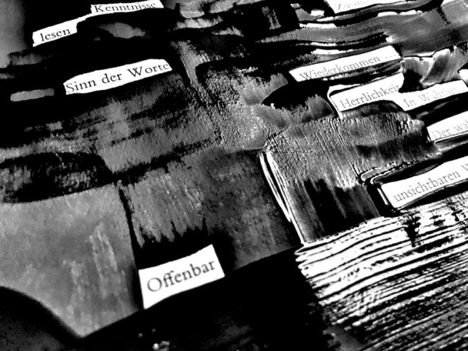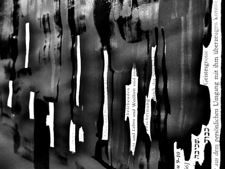 Im eigenen künstlerischen Prozess mit Acrylfarbe und einem regnerischen, monotonen Rauschen im Hintergrund. Literaturseiten hebräischen Ursprungs inspirieren mich, der Botschaft von Worten nachzuspüren. Was will heute gesehen werden? Was ist gar befremdlich und reizvoll zugleich?
