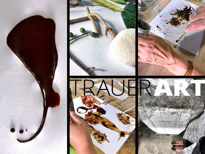 Was zeigt sich, wenn ich loslasse? Wie lasse ich los, um meinen Wünschen zu folgen? Orientalischer Mokka wurde beim sommerlichen Abendregen genossen. Der Kaffeesatz floss über grobfaseriges Papier. Mit Fundstücken aus der Natur wurde er vermengt mit Feigencreme und entfachte einen süß-aromatischen Duft. Das Papier, das Material schien ein Eigenleben zu entwickeln – sich zu wellen, zu gären, auszudehnen. In der Beobachtung und im Dialog wurde reflektiert und die Zukunft anvisiert.