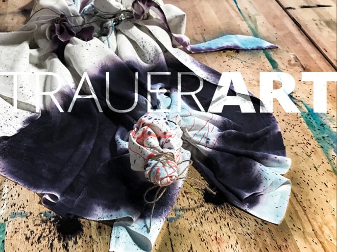 Donnerstag, 1. September 2022: Im Trauerprozess schwimmen wir im Bad unterschiedlichster Seinszustände. Wir wechseln zwischen der Leichtigkeit und Schwere. Dieses Pendeln spürten wir mit Tuchlaken und Batikfarben nach. Der Song Capita untermalte dabei: „Perdere la forza di gravità. Complicato e semplice …/Verlust der Schwerkraft. Kompliziert und einfach.“